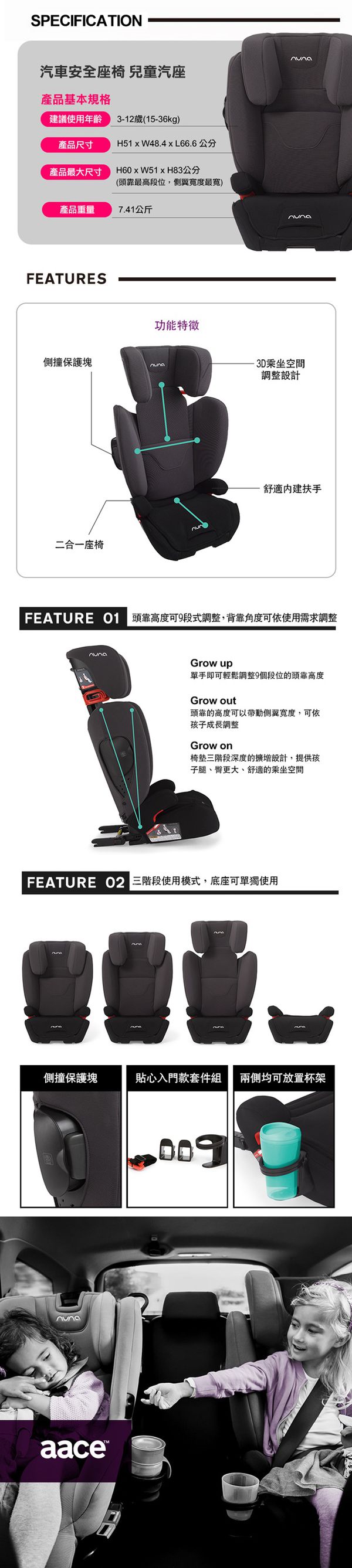 產品尺寸:H51xW48.4xL66.6產品最大尺寸(cm): H60xW51xL83(頭靠最高段位,側翼寬度最寬)座椅內寬: 40cm適用年齡:3-12歲(15-36kg)產品重量:7.41kg材質:塑膠、五金、布產地:中國