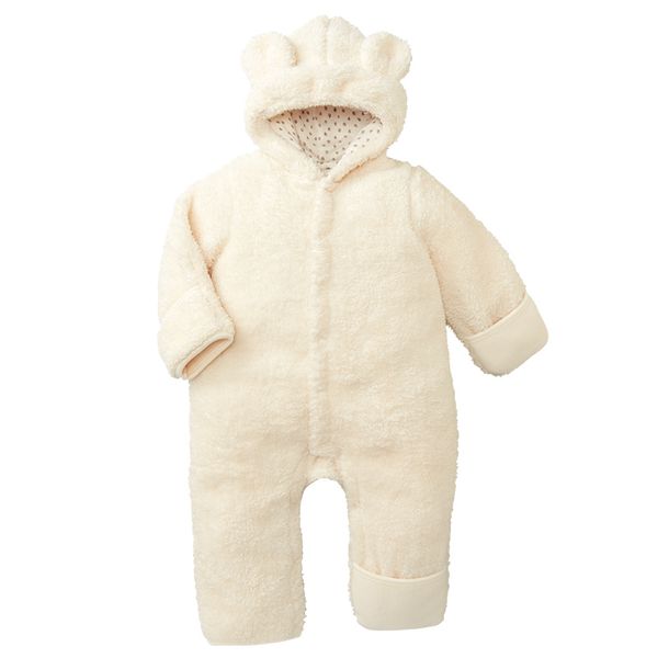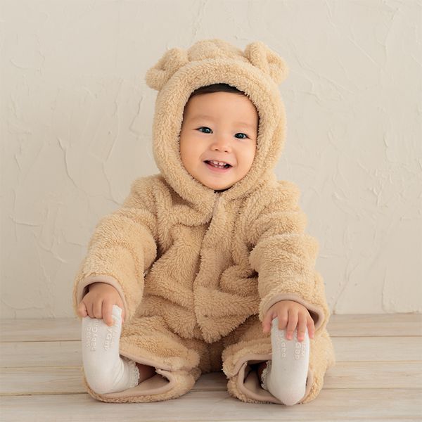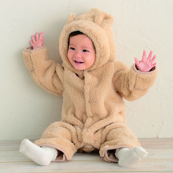 可將腳尖、指尖部分折起,就像穿了腳套、手套一樣全身暖呼呼。刷毛設計光看就覺得非常保暖,適合當作防寒用的連帽哈倫包屁衣。帽子上的耳朵非常吸睛。上襠分岔處有防止扣錯的有色暗扣,方便爸媽幫寶寶換衣服。