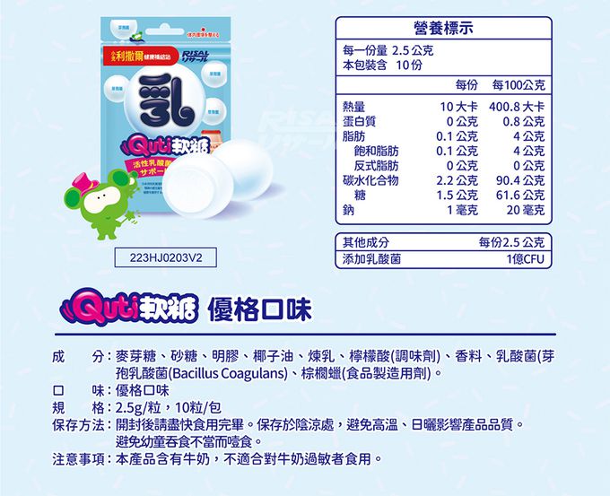 成分:麥芽糖、砂糖、明膠、椰子油、煉乳、檸檬酸(調味劑)、香料、芽孢乳酸菌(Bacillus Coagulans)、棕櫚蠟(食品製造用劑)