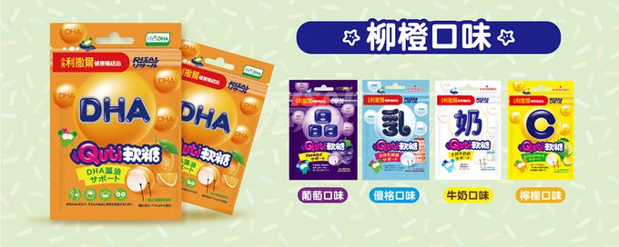 成分:砂糖、麥芽糖、椰子油、明膠、柳橙濃縮汁、檸檬酸(調味劑)、DHA藻油(含DHA 35%)、香料、天然食用色素(薑黃色素、花青素)、棕櫚蠟(食品製造用劑)