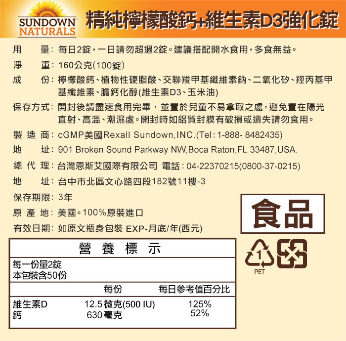 美國Sundown日落恩賜 - 精純檸檬酸鈣+維生素D3強化錠_效期至2022/6/30-100錠-3年