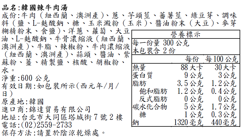 內容物韓國Sunbong - 牛肉辣湯600g