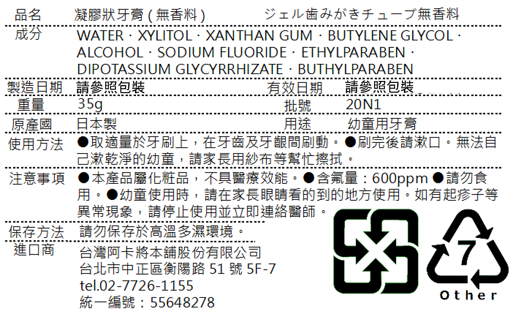 材質:Water・Sodium Fluoride・Xylitol・Dipotassium Glycyrrhizate・Xanthan Gum・Butylene Glycol・Alcohol・Ethylparaben・Buthylparaben・Flavor