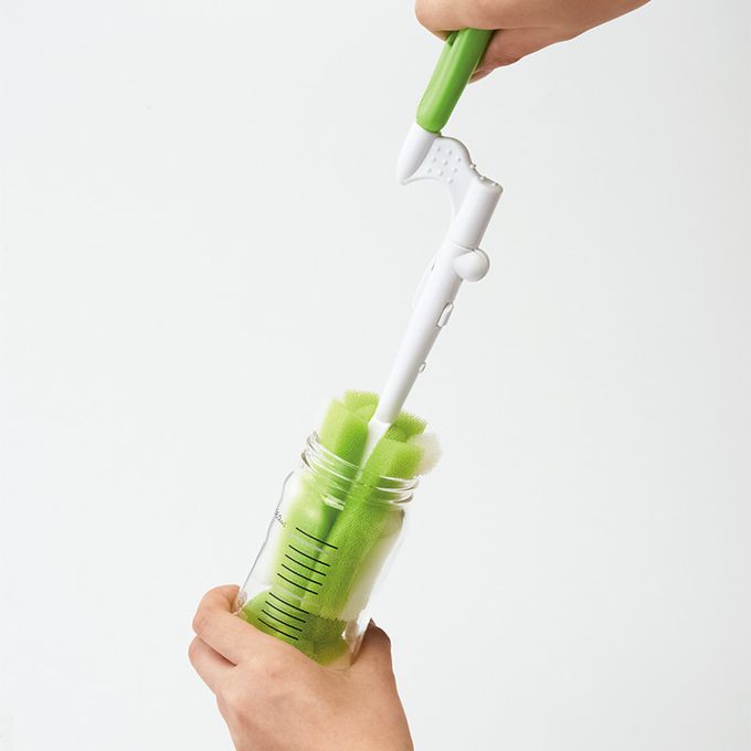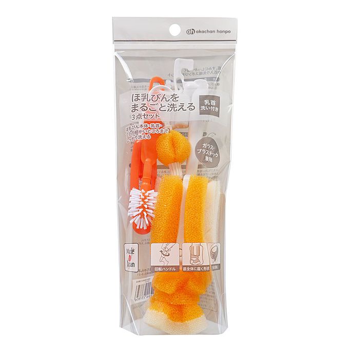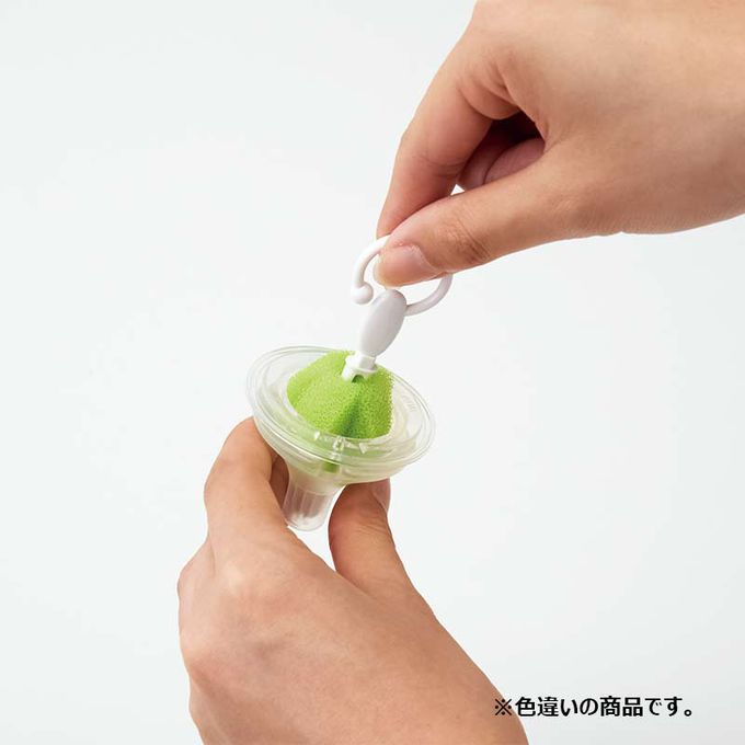●奶瓶刷前端的海綿用尼龍製固定器具固定住,海綿內側則有聚丙烯製的芯。為了保護奶瓶,固定器具用黃色的海綿帶圈住。固定器具及芯並沒有銳利的部分,但有一些突起的地方。雖然手碰到突起處並不會受傷,但在洗刷具或將水擰乾等,要握前端的部分時,請輕握。黃色海綿及前端的部分如有破損請立即停止使用。