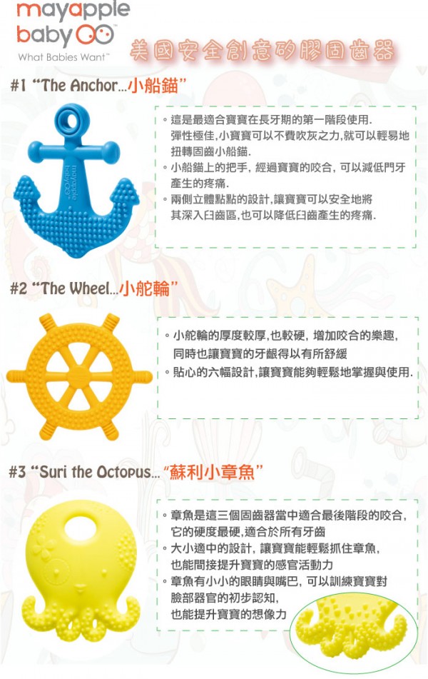 進入口腔期的寶寶什麼東西都往嘴裡塞,安全無毒材質的固齒器是最重要的,Mayapple固齒器,分階段硬度不同,剛長牙的寶寶能咬彈性較高的小船錨款式,牙齒發展較健全的寶寶適合硬度較硬的章魚固齒器,立體點點顆粒還能訓練寶寶手部的肌肉喔!本商品不含BPA、鄰苯二甲酸酯 (塑化劑)和鉛等化學成分,請媽咪放心讓寶寶含咬。