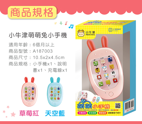 現在小朋友從好小就開始接觸 3C 了,即使是小寶寶看到爸爸媽媽滑手機,都會想要搶著玩,有時抵不過就只好讓他們玩一下下,但如果長時間下來真的會傷眼睛ㄟ.....(而且還會被摔倒Σ(`L_` )於是小牛津乾脆出了一台專屬寶寶的有聲小手機-「萌萌兔小手機」,造型真的超級可愛的啦!先來看看官方釋出的介紹影片吧☟☟☟