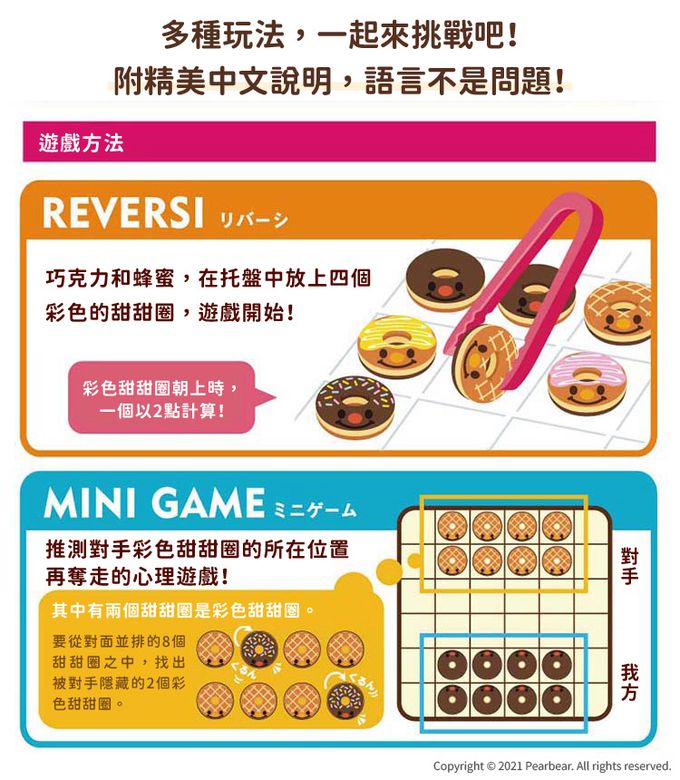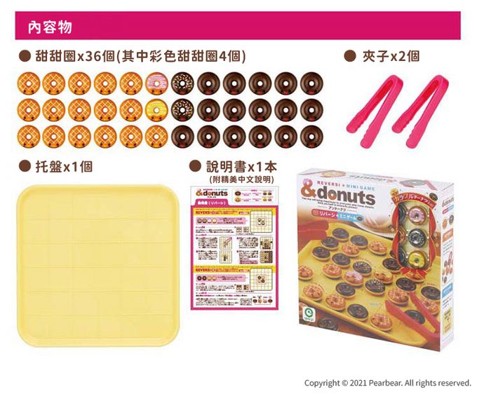 首先,在棋盤中央擺上四顆特殊款當作起點,猜拳贏的人可以先攻。接著每回合輪流擺放棋子,看誰包圍對方最多~就能擁有越多甜甜圈!