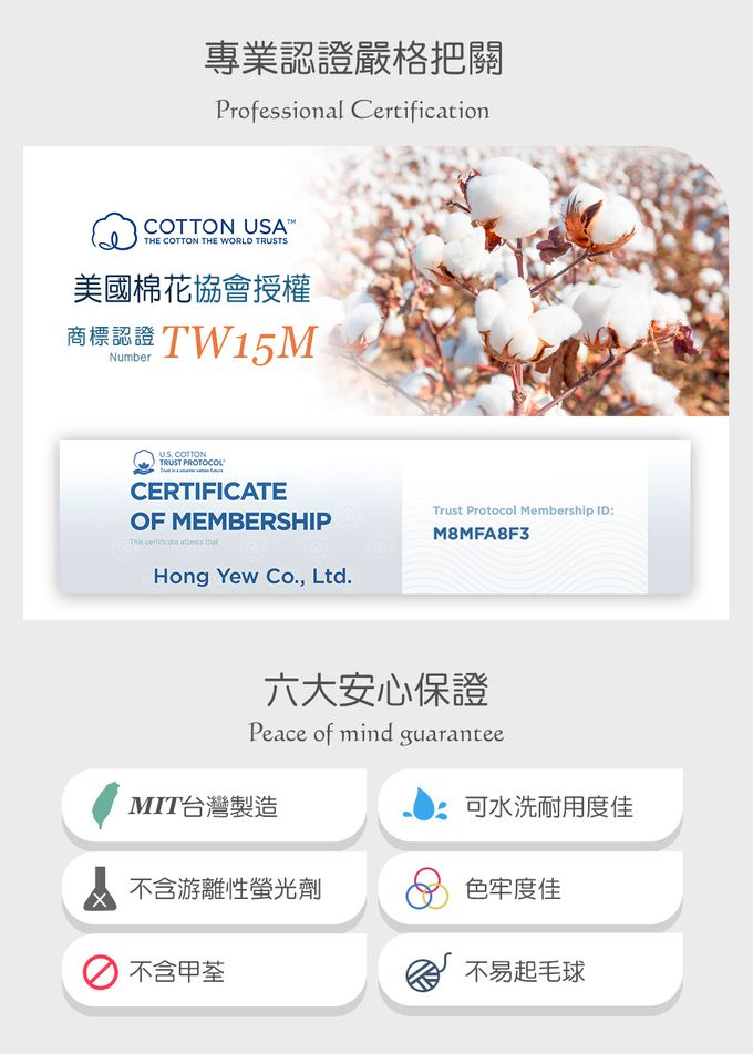 台灣的紡織業是世界聞名,真的不一定國外品牌才有好品質,鴻宇的睡袋表布都通過美國國際棉花協會授權認證廠商,使用100%美國棉,質感厚實,睡起來柔軟親膚又透氣,而且非常耐洗不掉色喲!