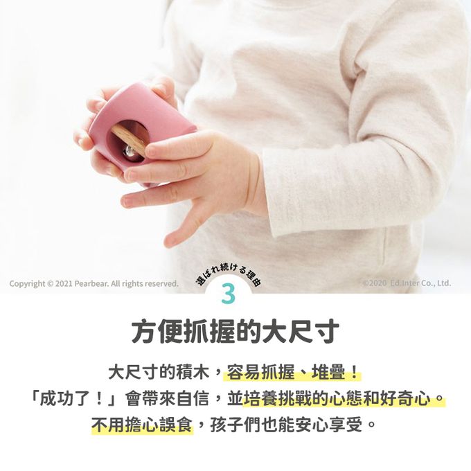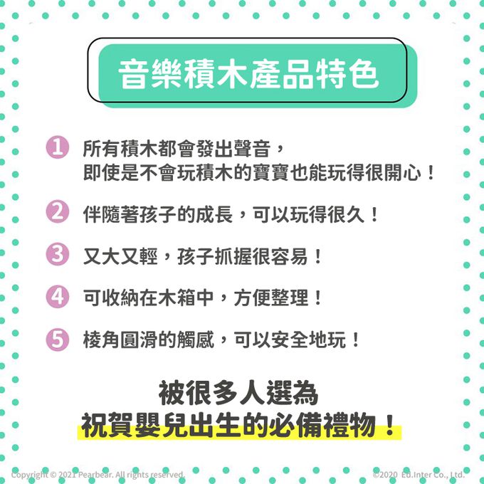 每個積木都有不同的特色,大尺寸設計讓小孩們更方便拿握,積木上只塗上簡單無毒的顏料,絕對是讓小朋友第一次接觸音樂最好的選擇。