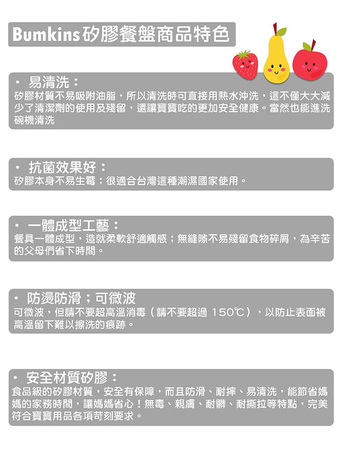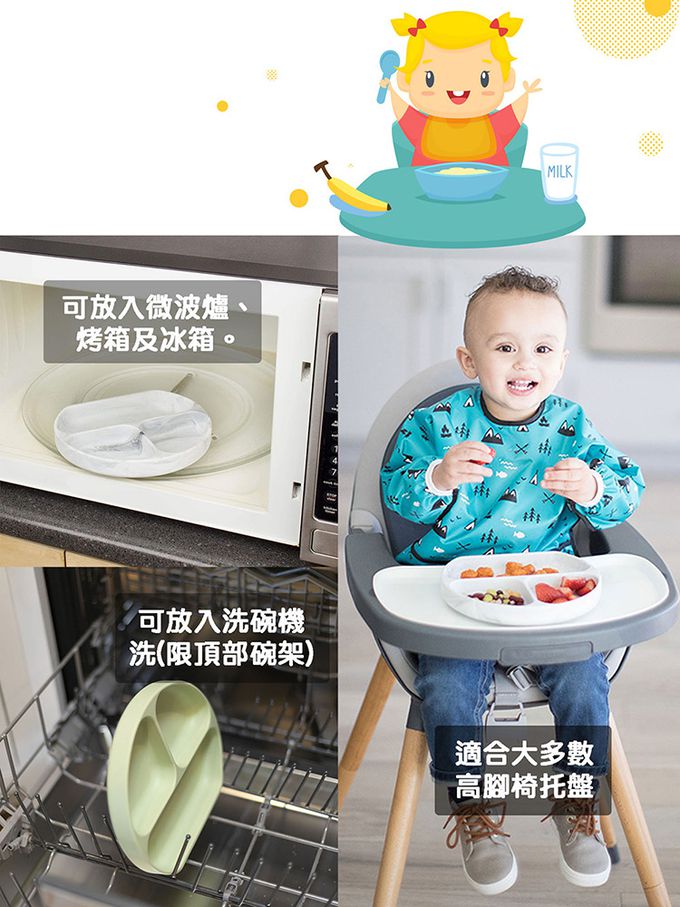餐盤採用矽膠材質,不易吸附油脂,可直接用熱水沖洗,減少清潔劑的使用及殘留,讓寶寶吃得更安全健。矽膠本身也不易發霉,很適合台灣潮濕的國家使用