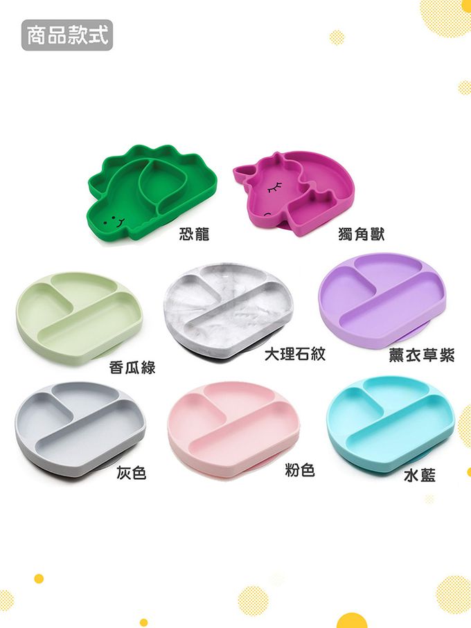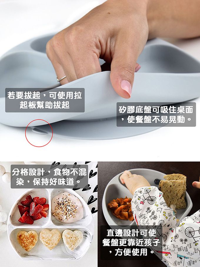 餐盤底部有矽膠吸盤,可吸住桌面,使餐盤不易晃動