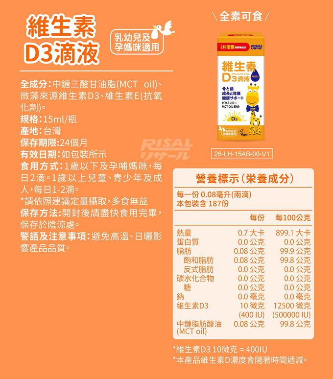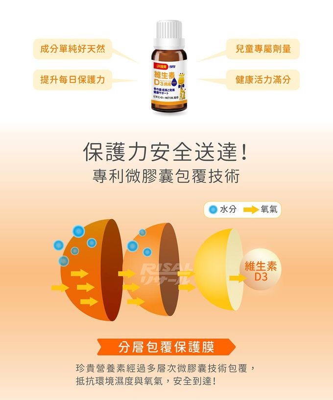 滴液設計讓食用上更便利,媽咪只要倒置靜待7-10秒,加入水中就能給孩子食用囉!使用中鏈脂肪酸(MCT oil)為基底,天然無添加,每日兩滴=400IU活性D3補充!