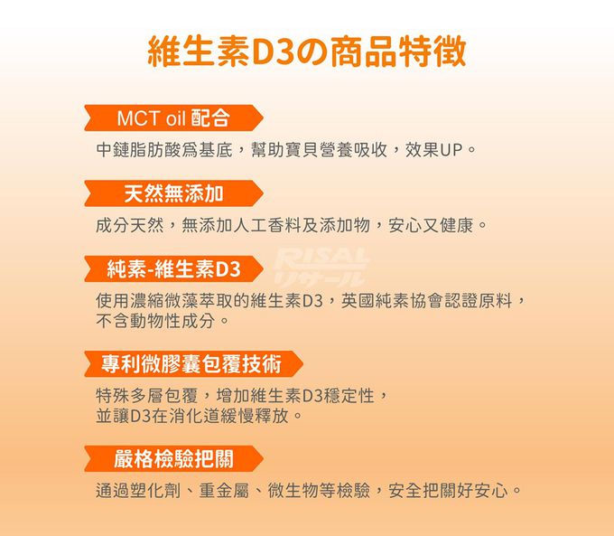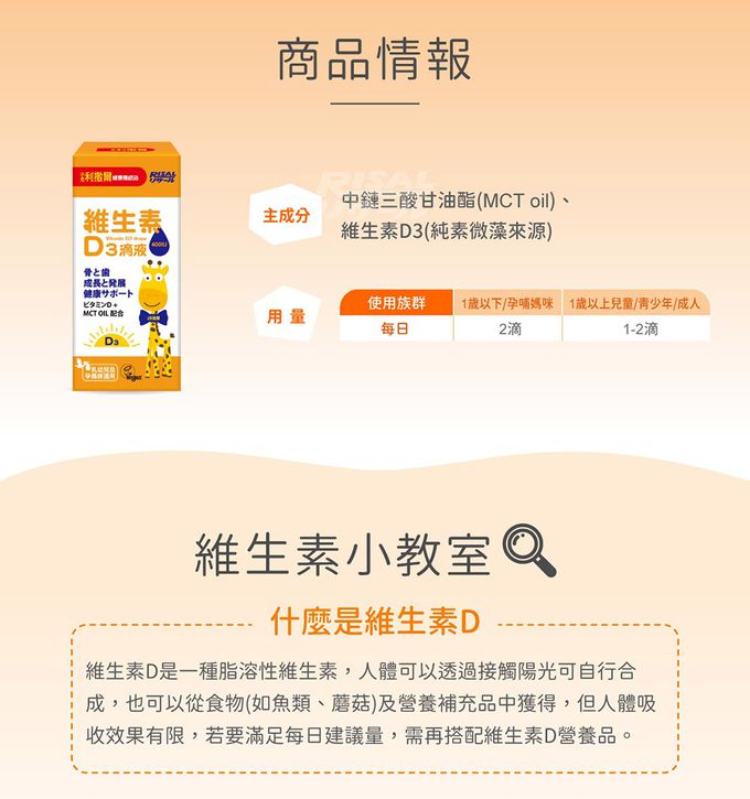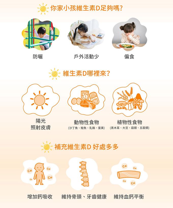 相信媽咪們都有聽過補充維生素D的重要性,它是一種脂溶性維生素,可以透過曬太陽和食物攝取獲得,不過有時候天氣不好、或是一整天待在室內,很怕孩子的維生素D不足呀!這次開團的新品就推出了「維生素D3滴液」❤ 每天兩滴就能輕鬆補充所需營養哦!