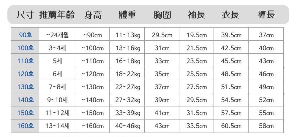 尺寸:90[80-86cm]/100[87-96cm]/110[97-106cm]/120[107-116cm]/130[117-126cm]/140[127-135cm]/150[135-145cm]/160[146-155cm]