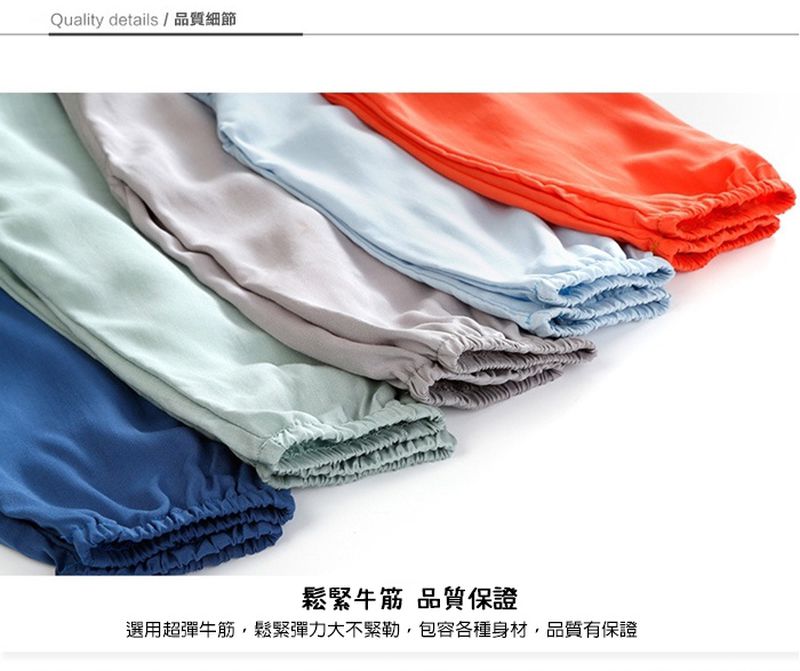 選用超彈牛筋,彈力大不緊勒,腰間繫帶讓褲子穿起來寬鬆舒服又能不怕掉;收口褲腳讓蚊蟲入侵不了,上廁所脫褲子也不會掉到髒髒的地上,真的是很方便呢!