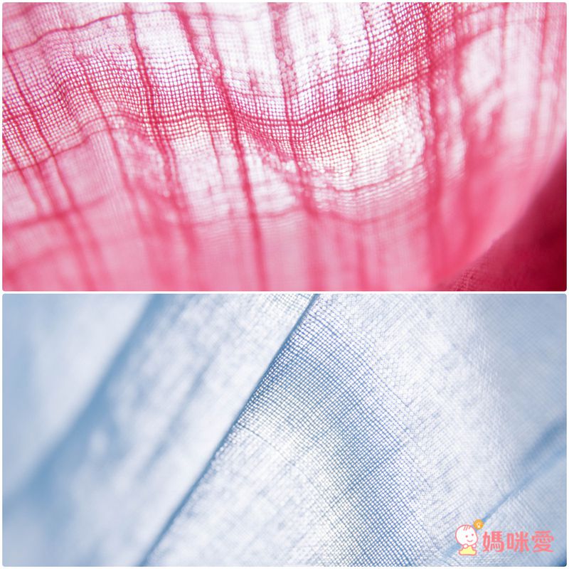 同步跟其他材質做了比較,上面是棉麻材質,透光拍攝可以看到布料上會有較明顯的棋盤狀紋路;而絲綢的透氣孔分佈均勻,且幾乎密不可見,既漂亮又透氣,不必擔心絲綢會悶哦!