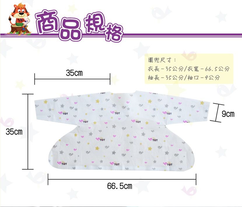 適用年齡為6個月以上材質:SMS不織布圍兜尺寸:衣長 - 35公分/衣寬 - 66.5公分袖長 - 35公分/袖口 - 9公分
