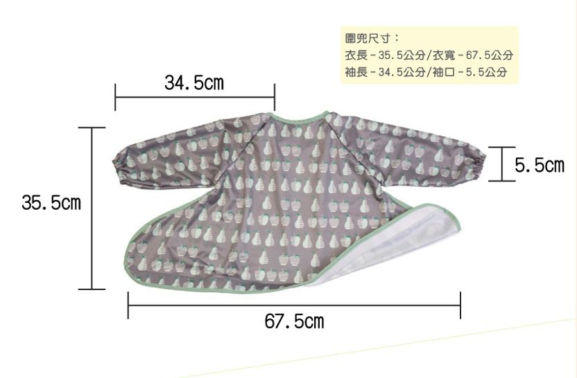 適用年齡為6個月以上圍兜材質:100% 聚脂纖維 + TPU 塗層圍兜尺寸:衣長 - 35.5公分/衣寬 - 67.5公分袖長 - 34.5公分/袖口 - 5.5公分