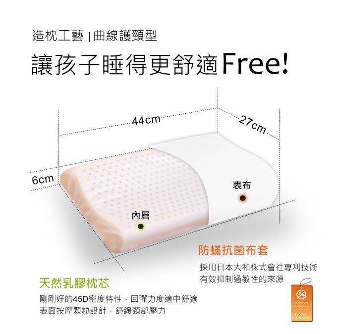 專為學齡期幼童設計的天然乳膠枕,高彈力、高支撐性,且高度符合幼童的頸部高度,十足的保護重要的頸椎!