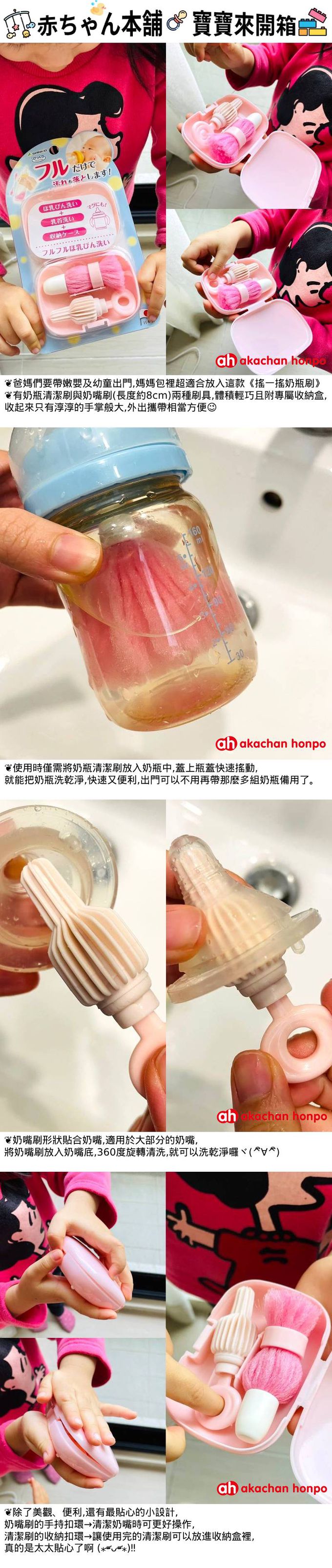 每次帶寶寶外出的時候,最麻煩的就是洗。奶。瓶!(´゚д゚`) 要編媽隨身攜帶清潔刷也太尷尬了吧~一般市售的刷具都是長條形狀、體積偏大,用後還真不知道怎麼收進包包裡... 【 日本阿卡將 akachan honpo - 搖一搖奶瓶刷 】是編媽最近找到的好物!體積剛剛好、形狀合適、刷具柔軟不刮,而且清洗起來超不費力、只要搖一搖就完事了~對一天要洗好多次奶瓶的編媽來說,真的是一大福音 (*´∀`)~♥