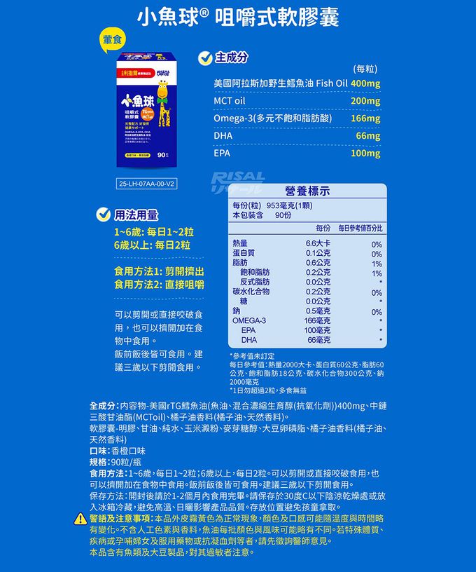 • 注意事項: 本品外皮霧黃色為正常現象,顏色及口感可能隨溫度與時間略有變化。不含人工色素與香料,魚油每批顏色與風味可能略有不同。