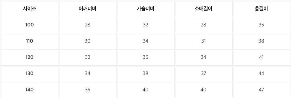 尺寸表(單位cm),由左至右:尺寸、肩寬、胸寬、袖長、總長