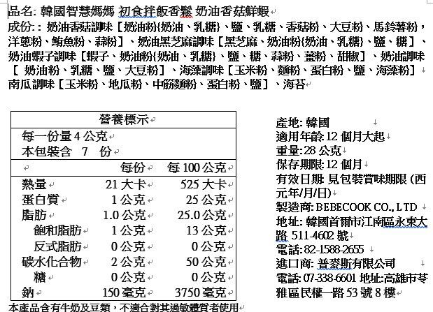 成分:奶油香菇調味粉【奶油粉{奶油、乳糖}、鹽、乳糖、香菇粉、大豆粉、馬鈴薯粉,洋蔥粉、鮪魚粉、蒜粉、酵母萃取物】、奶油黑芝麻調味粉【黑芝麻、奶油粉{奶油、乳糖}、鹽、糖、香料】、奶油蝦子調味【蝦子、奶油粉{奶油、乳糖}、鹽、糖、蒜粉、薑粉、甜椒、酵母萃取物】、奶油調味【 奶油粉、乳糖、鹽、大豆粉、酵母萃取物】、海藻調味【玉米粉、麵粉、蛋白粉、鹽、海藻粉】、南瓜調味粉【玉米粉、南瓜粉、中筋麵粉、蛋白粉、鹽】、海苔