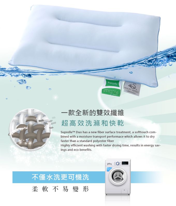 特殊車縫法,牢牢固定德國專利纖維,讓水洗枕更耐用也不跑棉!