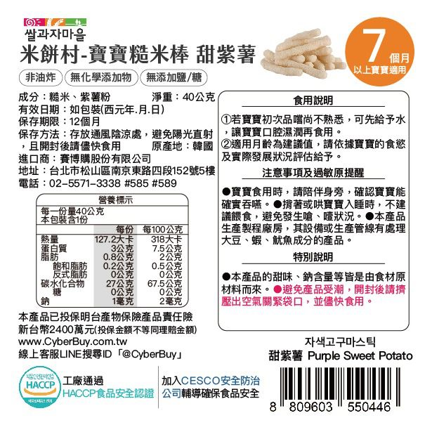 韓國SSALGWAJA米餅村 - 免運組-寶寶糙米棒-蔬菜口味4入組-甜紫薯*2/胡蘿蔔*2-40g/包,共4包