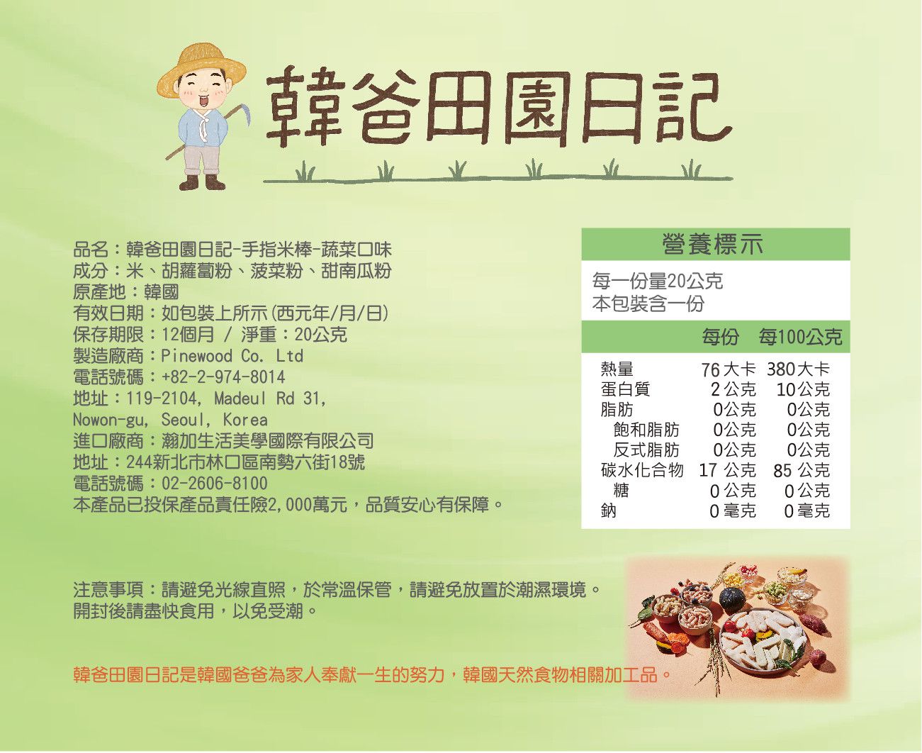 韓爸田園日記 - 手指米棒-蔬菜口味(6個月以上)-1包/20公克