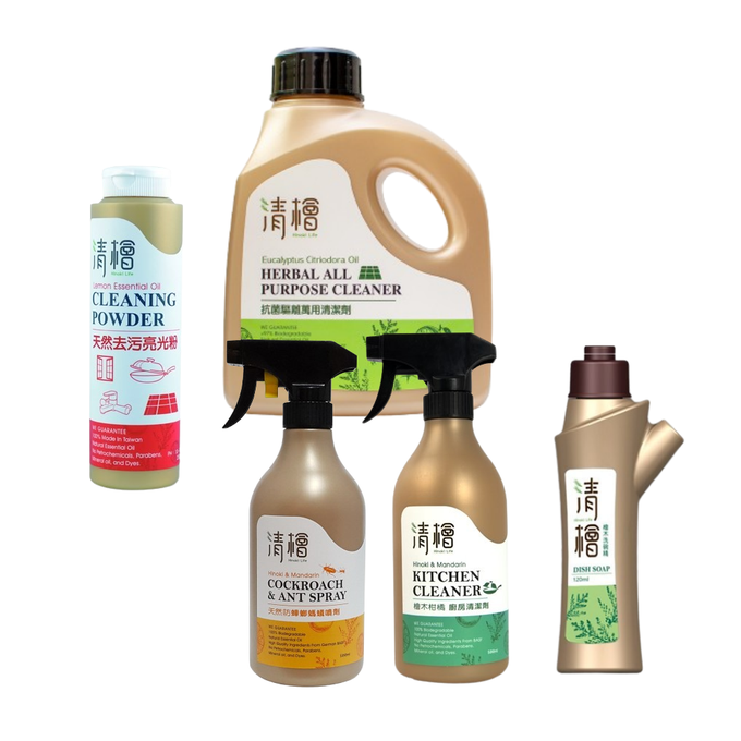 清檜 Hinoki Life - 大掃除廚房特惠組-廚房清潔劑+天然去污亮光粉+洗碗精+抗菌驅離萬用清潔劑+天然防蟑螂螞蟻噴劑
