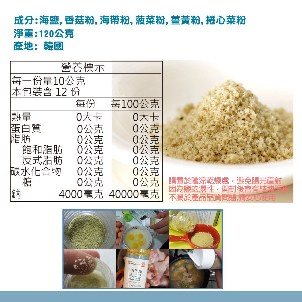 成分:海鹽,香菇粉,海帶粉,菠菜粉,薑黃粉,捲心菜粉