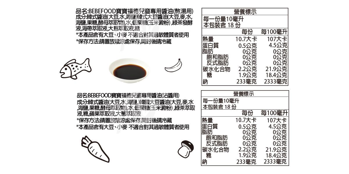 成分:韓式醬油(大豆,水,海鹽,)韓國大豆醬油(大豆,麥,水,海鹽,果糖,酵母萃取物),水,低聚糖(玉米澱粉) ,綠茶萃取液,糖,蘋果萃取液,大蔥萃取液
