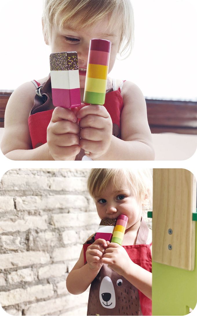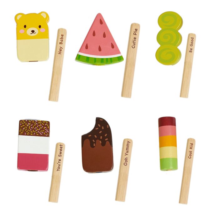 一個有趣而精彩的冰棒店!6種美味且不同口味的冰棒,全部由實木製成,並塗上美味的顏色。所有的棒子都可以拆卸,並在隱藏部分印有甜美的小訊息。和朋友一起進行混搭和猜迷遊戲!