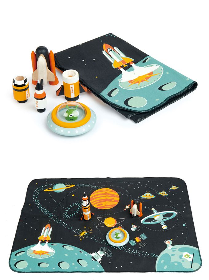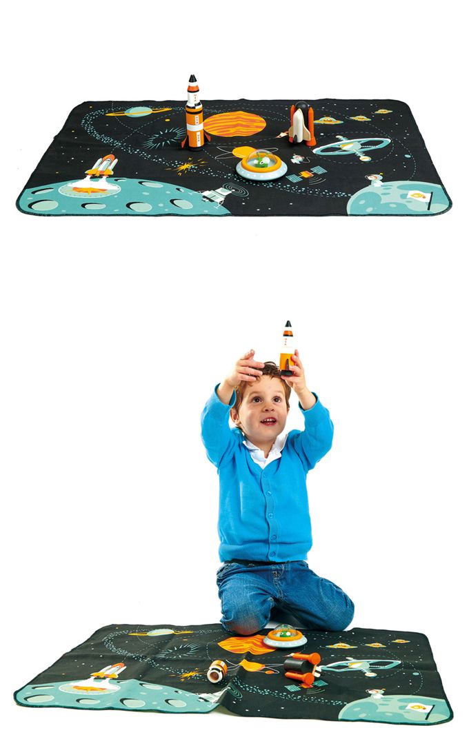 ★ 內含:1架三段式火箭、1架運載火箭、1艘飛碟以及帆布遊戲墊。