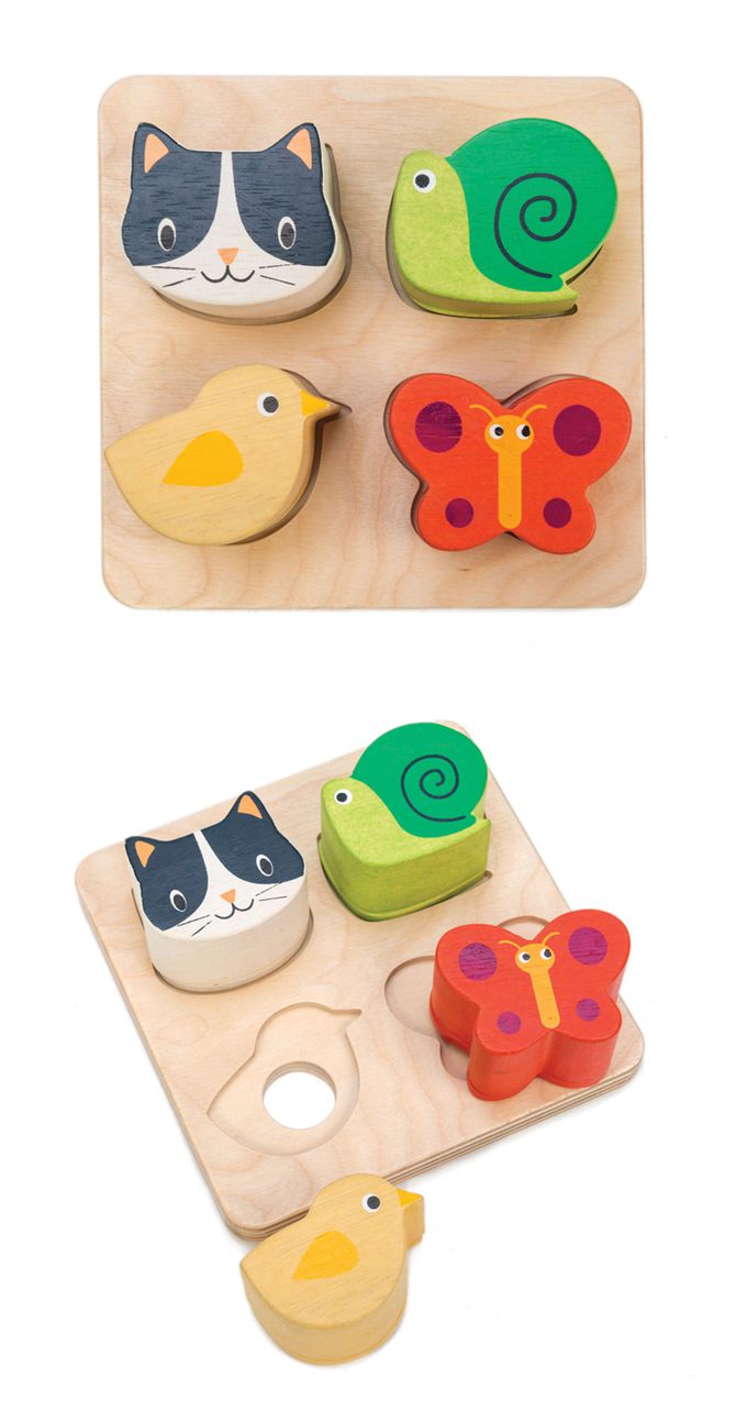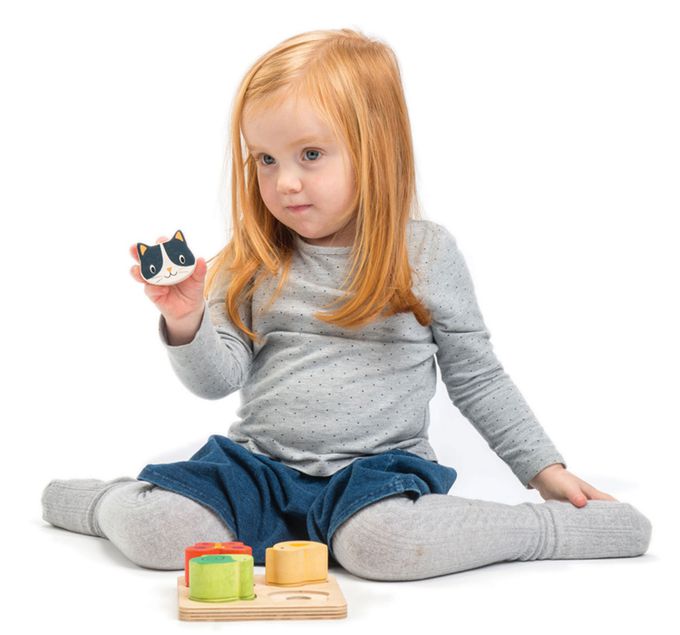 這套玩具的積木底部包含四種不同觸感的材質,將實木動物放在相對應的形狀分類盤上呈現。透過遊戲促進顏色和形狀的認識。