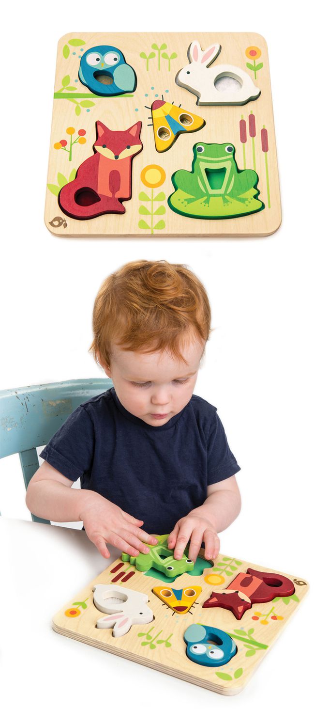 通過觸摸感官動物來刺激孩子的感官。抬起形狀並感受這5種不同動物下的紋理。鼓勵孩子學習語言,發現觸覺感官。