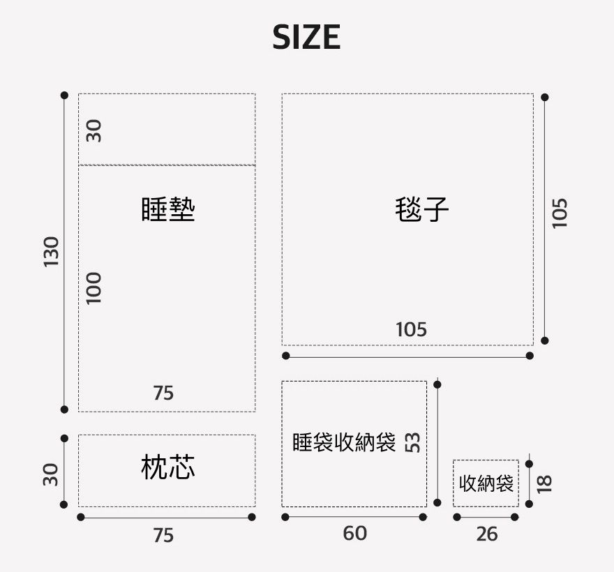 規格:睡墊 75x100cm、棉被 105x105cm、枕頭 75x30 cm