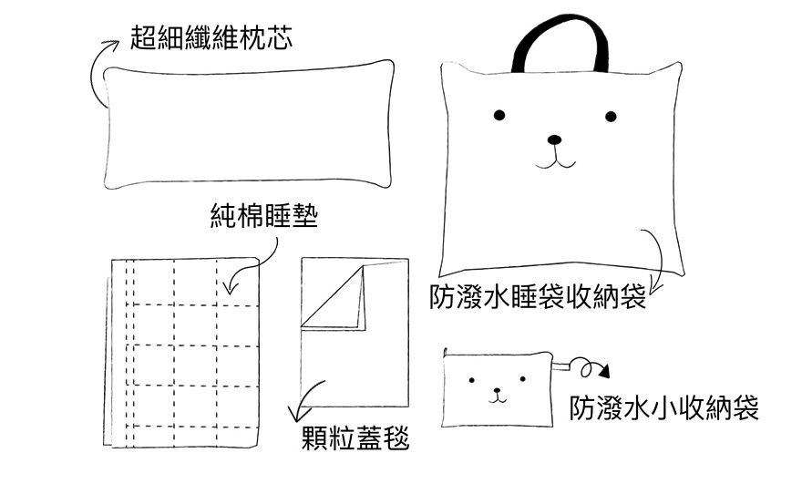 內容物:睡袋 x1(含可機洗枕頭 x1、顆粒四季被 x1、睡墊 x1)+收納袋 x1+小收納包x1