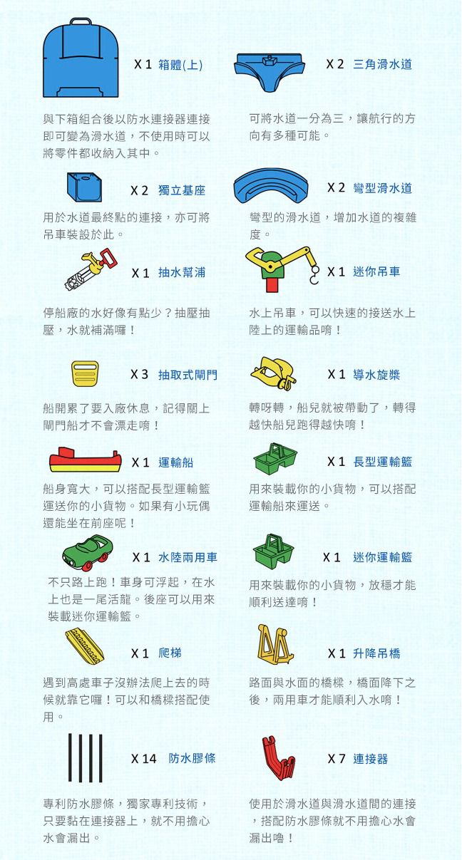 配件包含:組裝大型軌道的連接器、防水膠條、滑水道和右上角的火山主體(灰);還有小機關如木橋(可連接火山與水道)、閘門(控制水流)、抽水幫浦、擋板(先禁止一端通行,船才不會相撞)...等。