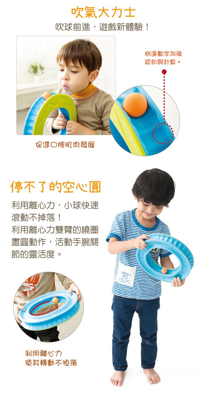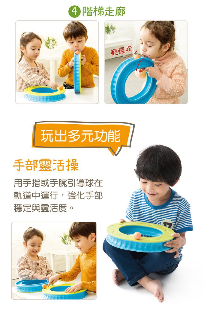 嘴巴吹氣讓球在外部軌道滾動,提升孩子口腔肌肉力氣,及手和嘴巴的協調力。