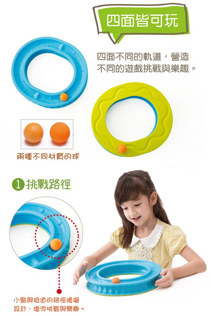 以一個空心圓的上、下、裡、外四個面設計不同路徑,不同的視覺追視遊戲,提升專注力。