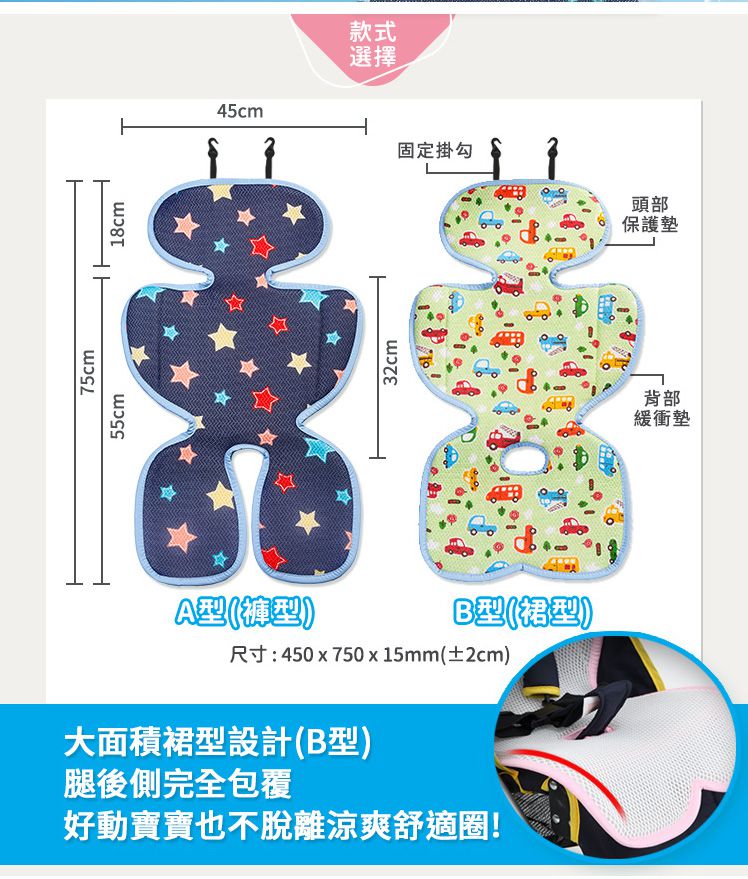 從老大開始使用,現在要生第二胎了,還是買一樣的商品, 一直覺得很好用,也不容易髒,好洗!快乾!汽座真的蠻悶熱的,用這個後透氣比較好一點!