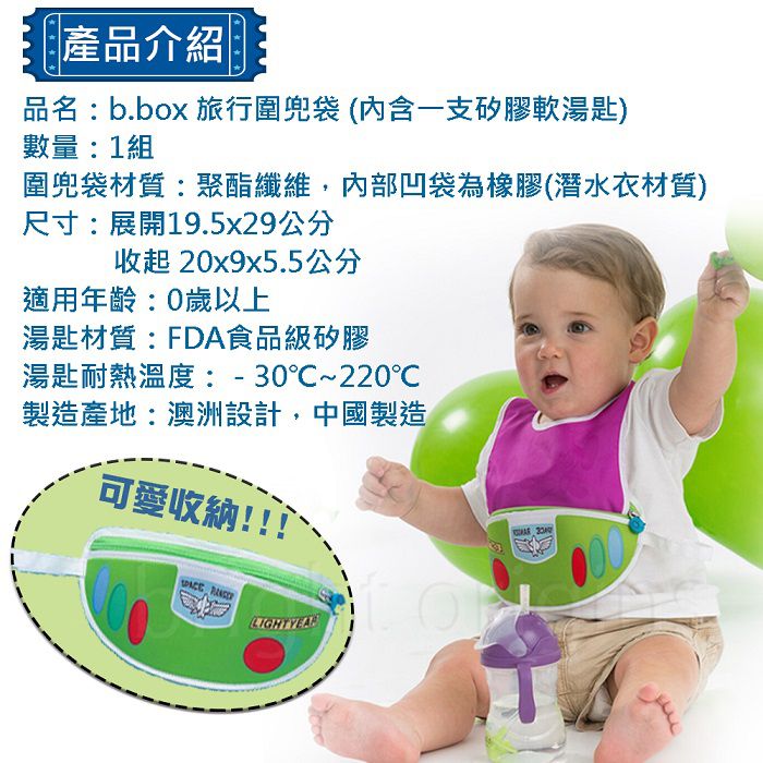 湯匙軟Q,不擔心寶寶牙齒咬或敲到。 可一起收在圍兜裡,攜帶很方便! 圖案整體來說很可愛,防水的效果也不錯 但出門吃完飯水洗沒有那麼快乾!