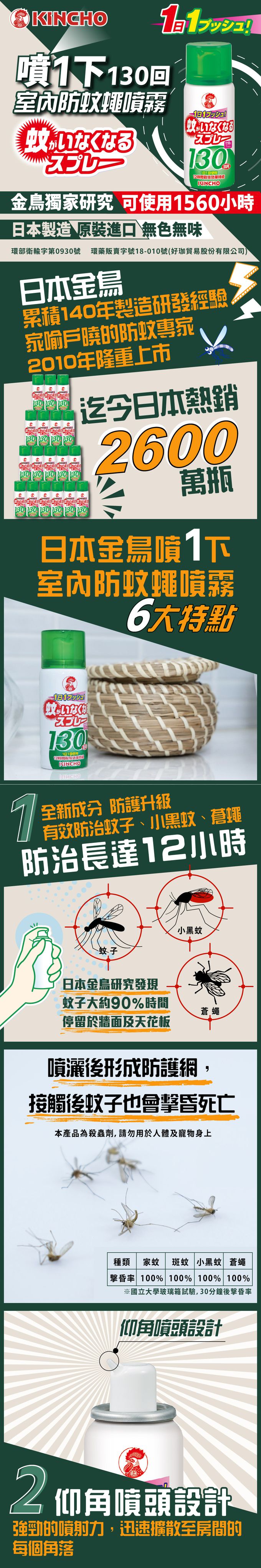 看到網路上很多人推、日本也賣翻的金雞噴霧!【日本金鳥 噴一下室內噴霧劑】,編媽就立刻買來開箱!試過真的驚為天人~噴一下效果長達12小時,一罐可以用130日左右。不用再辛苦打蚊子,什麼都不用作蚊子就會死光光!連小蜘蛛、小蟑螂都可以滅喔!而且無色無味,沒有討人厭的殺蟲劑味道,即使家裡有寶寶、寵物都可以使用(此噴霧含有菊精成分,養貓者不適用)。