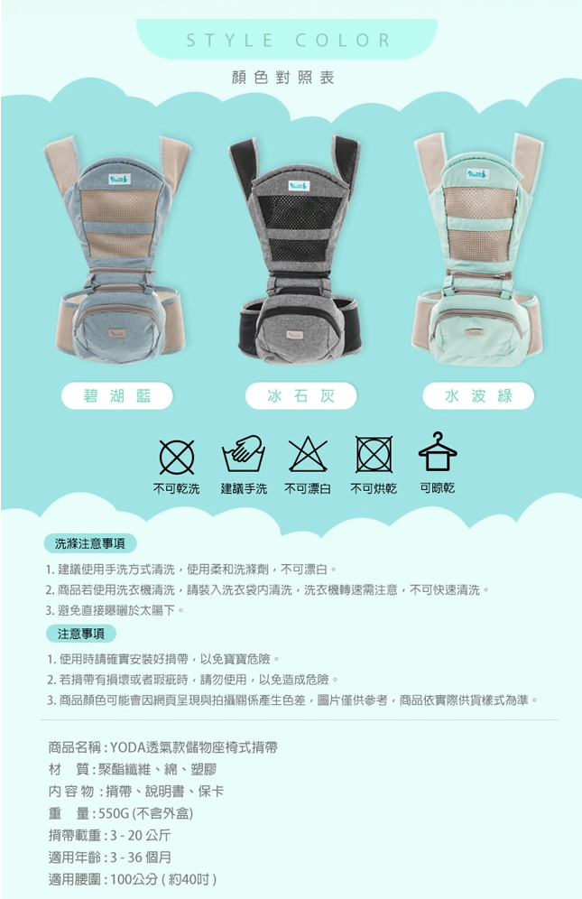 YoDa 透氣款儲物座椅式揹帶-透氣款-碧湖藍-3M~36M (約20kg)