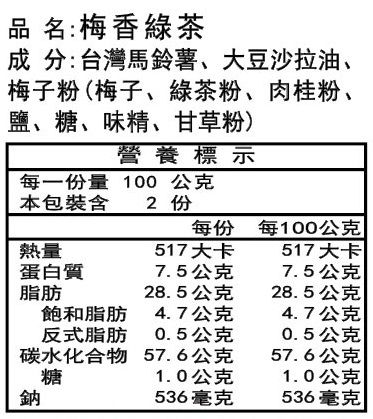 ✓ 梅香綠茶(純素,超厚切波浪):外銷日本台灣梅子磋粉,灑在滿是馬鈴薯鮮味的洋芋片上,厚實的口感加上微酸微甜的絕佳回甘滋味,是您絕對沒有吃過的口味!