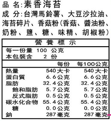 ✓ 素香海苔(奶素,平切薄片):進口無鹽大片海苔,媽媽們手揉製作大小不一的海苔碎片就是純粹手工的痕跡,保留海苔香氣與營養與金黃洋芋片最為絕配。