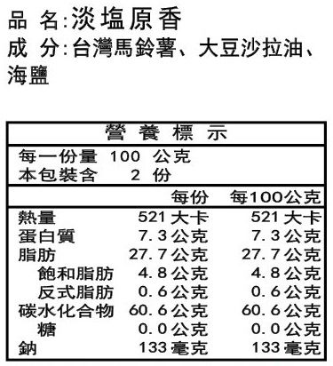 煌輝嚴選台灣無基改無農藥馬鈴薯切片,搭配的進口海鹽檢驗合格,選用發煙點比較高的純大豆沙拉油,100% 純黃豆精煉製成;光是油本身的質量就比較好,所以相較市售油炸品而言更安心,也沒有添加乳化劑、酸度調節劑等添加物,包裝上的成分很單純,沒有看不懂的化學公式!