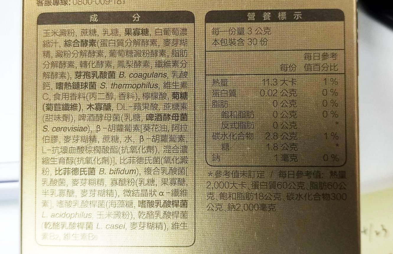 | 成分 | 玉米澱粉, 蔗糖, 乳糖, 果寡糖, 白葡萄濃縮汁, 綜合酵素(蛋白質分解酵素, 麥芽糊精, 澱粉分解酵素, 葡萄糖澱粉酵素, 脂肪分解酵素, 轉化酵素, 鳳梨酵素, 纖維素分解酵素), 芽孢乳酸菌B. coagulans, 乳酸鈣, 嗜熱鏈球菌S. thermophilus, 維生素C, 食用香料(丙二醇, 香料), 檸檬酸, 菊糖(菊苣纖維), 木寡醣, DL-蘋果酸, 蔗糖素(甜味劑), 啤酒酵母菌(乳糖, 啤酒酵母菌S. cerevisiae), β-胡蘿蔔素[葵花油, 阿拉伯膠, 麥芽糊精, 蔗糖, 水, β-胡蘿蔔素, L-抗壞血酸棕櫚酸酯(抗氧化劑), 混合濃縮生育醇(抗氧化劑)], 比菲德氏菌(氧化澱粉, 比菲德氏菌B. bifidum), 複合乳酸菌[乳酸菌, 麥芽糊精, 寡醣粉(乳糖, 果寡醣, 半乳寡醣, 麥芽糊精), 微結晶狀α-纖維素], 嗜酸乳酸桿菌(海藻糖, 嗜酸乳酸桿菌L. acidophilus, 玉米澱粉), 乾酪乳酸桿菌(乾酪乳酸桿菌L. casei, 麥芽糊精), 維生素B2, 維生素B6 |
